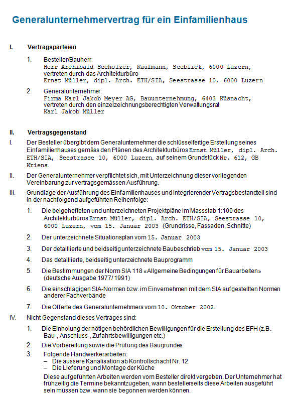 Muster Generalunternehmervertrag Einfamilienhaus